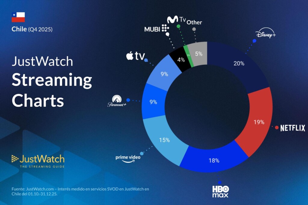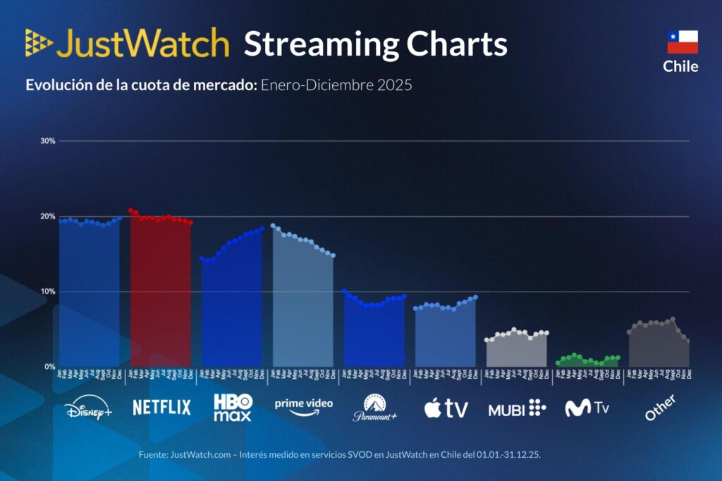 Detrás de estos datos hay una metodología pensada para capturar el comportamiento real de los usuarios: las cuotas de mercado de JustWatch se calculan en base a interacciones concretas como listas de seguimiento, clics hacia los servicios, filtros por plataforma y títulos marcados como “visto” dentro del sitio y las aplicaciones de JustWatch. El período analizado abarca desde el 1 de enero hasta el 31 de diciembre de 2025, y todas las cuotas se expresan como porcentajes enteros redondeados al entero más cercano, de modo que variaciones menores a ±0,5 puntos porcentuales se consideran estables. Esto significa que cada punto porcentual que sube o baja una plataforma representa un cambio real en el interés del público, y convierte a estos gráficos en una radiografía precisa de cómo los chilenos se relacionaron con el streaming a lo largo de todo 2025.